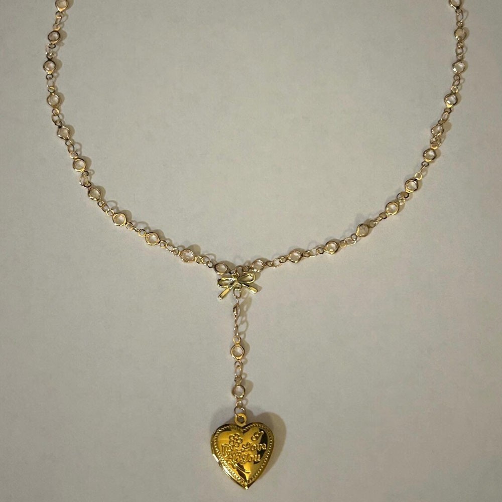 This stunning piece features clear crystal detailing, a little bow, and a locket dangle. So beautiful and elegant and a perfect piece to spice up a top. Adjustable in length.