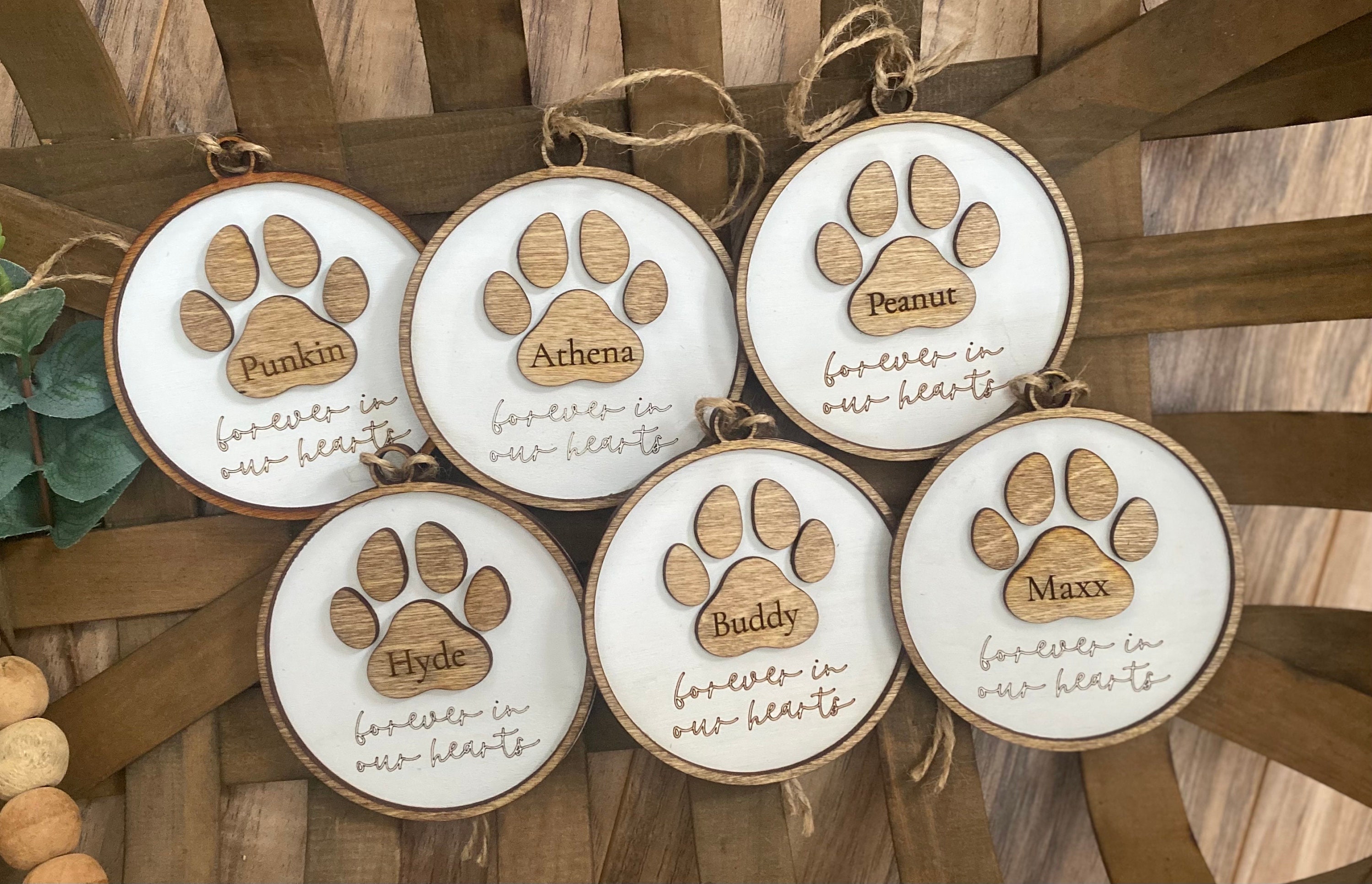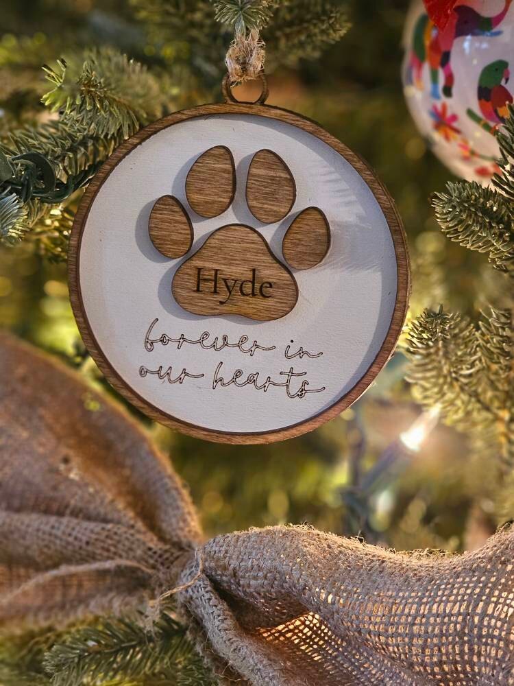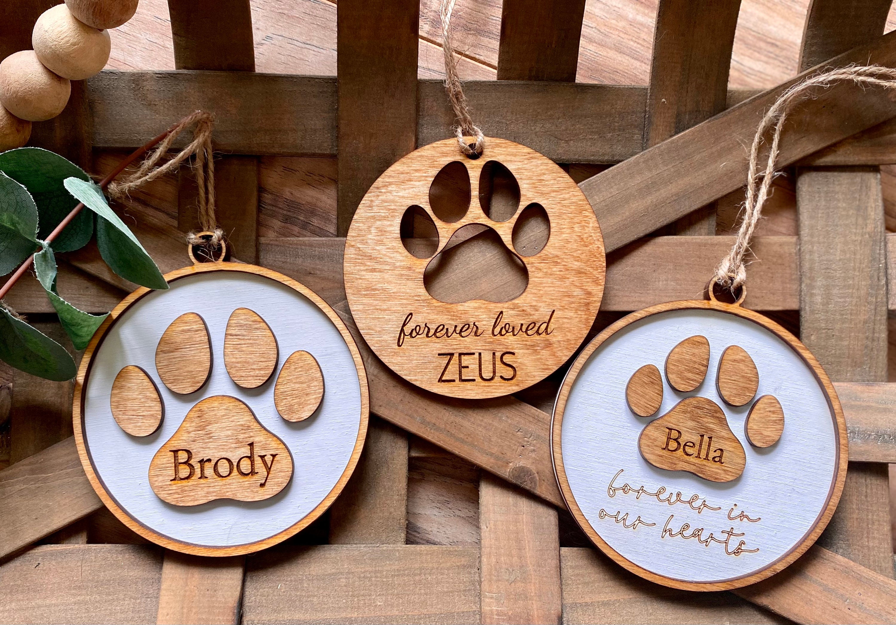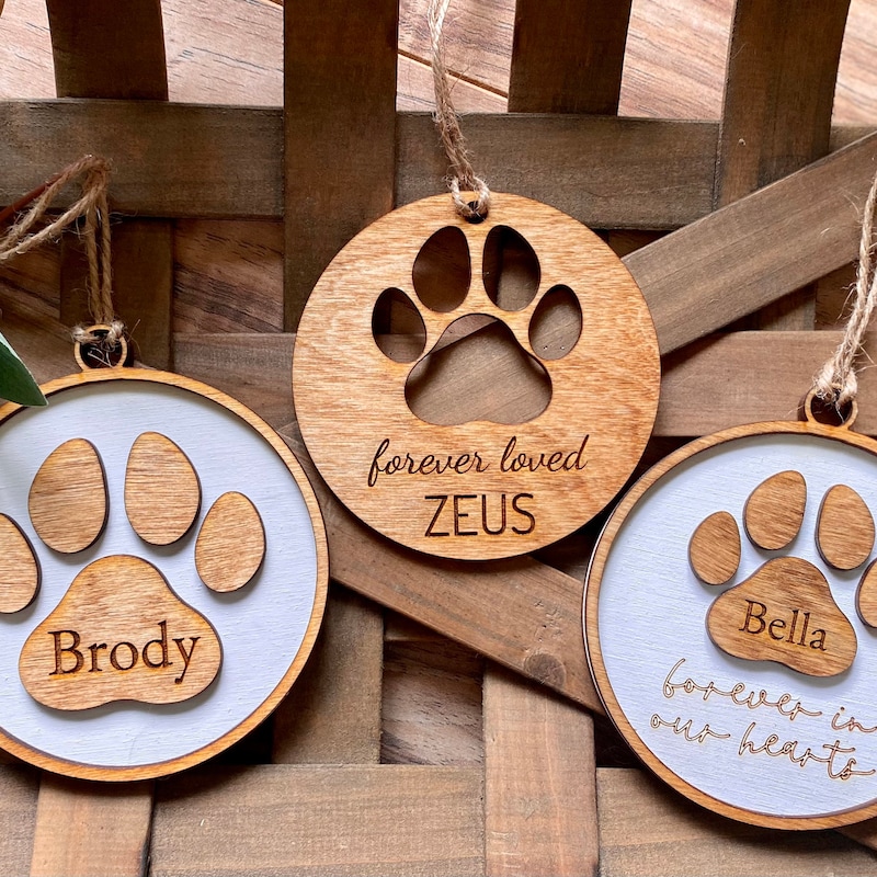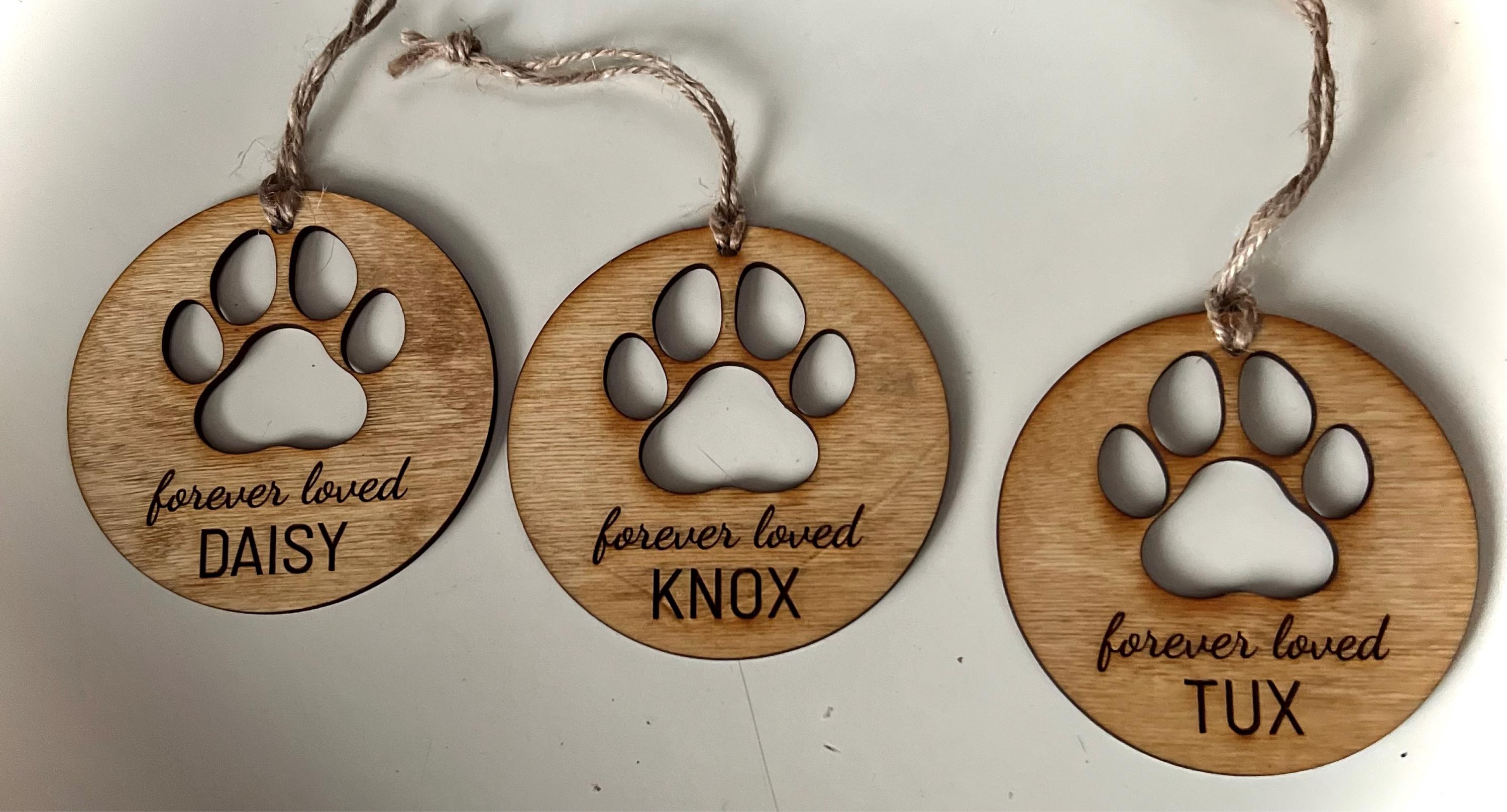 Honor your beloved pet with these beautiful laser cut and engraved wood hangings that make great gifts for family, friends, or any pet lover. Hang on your Christmas tree, stocking, or display year-round.