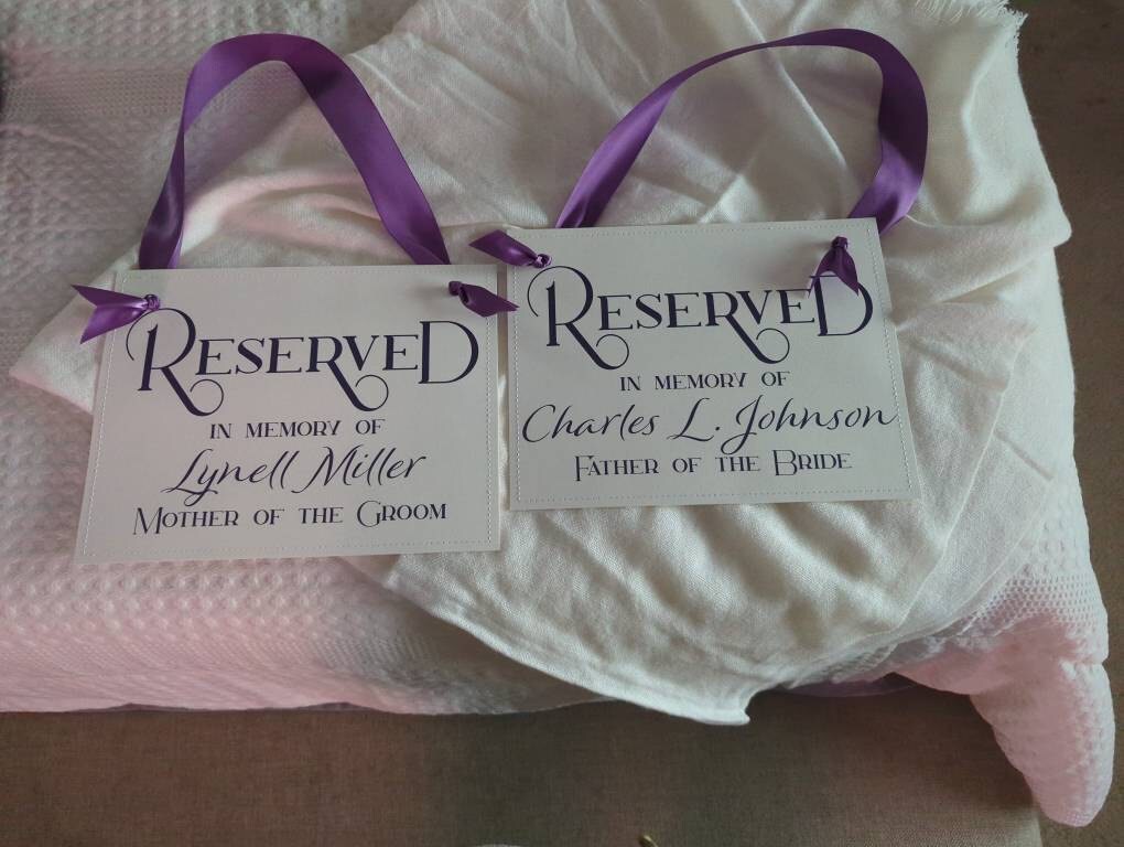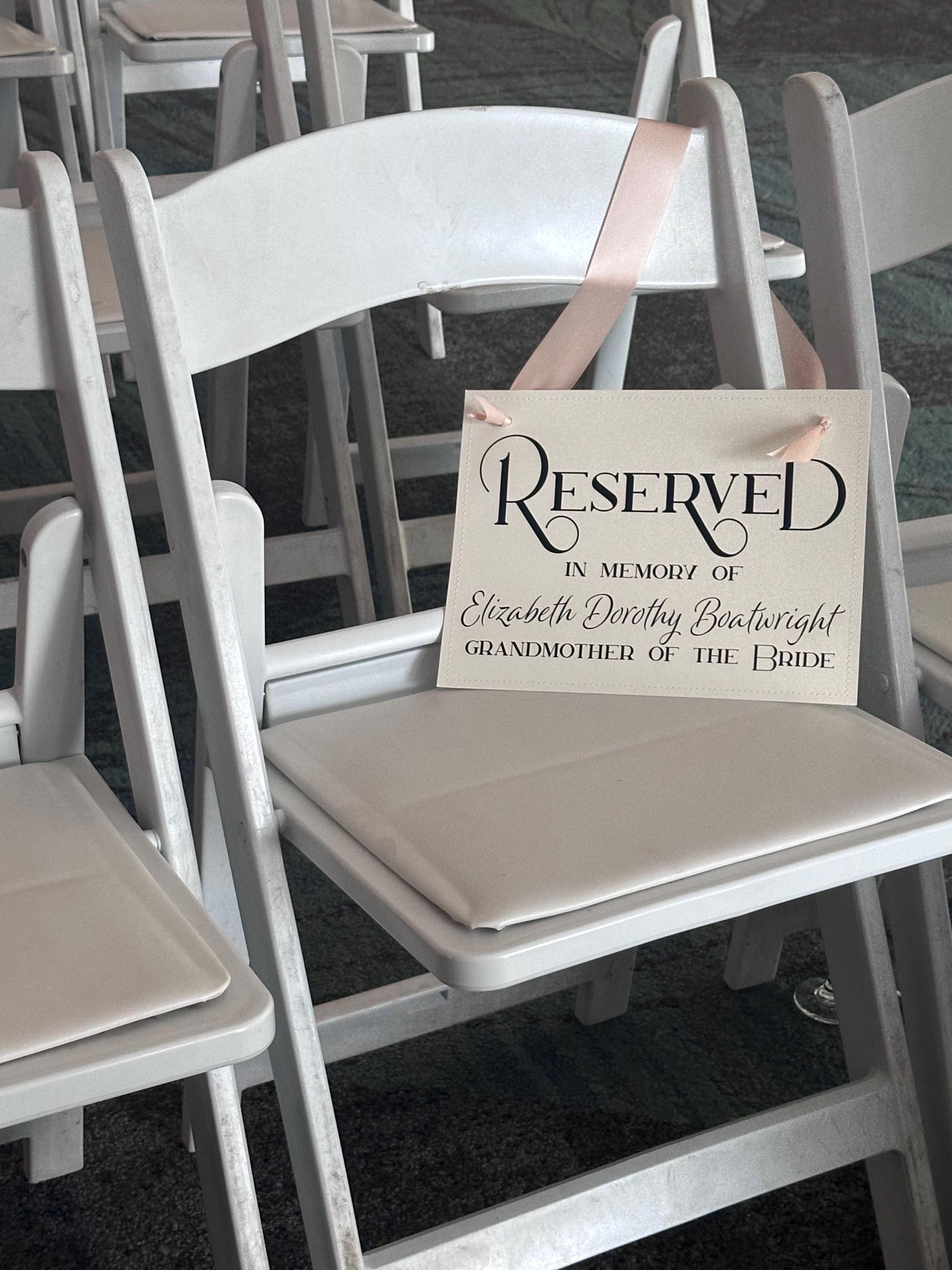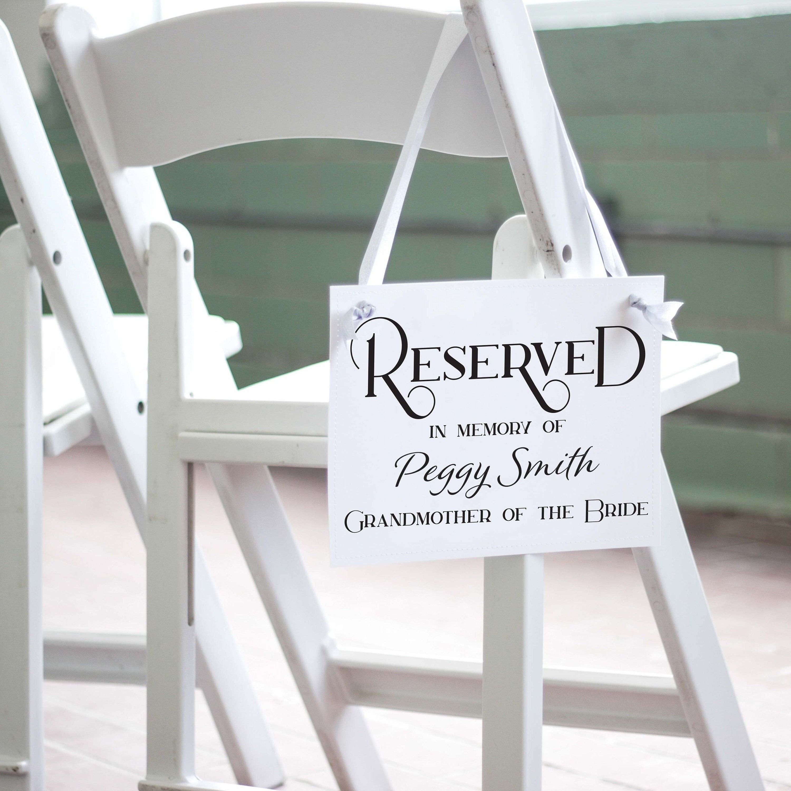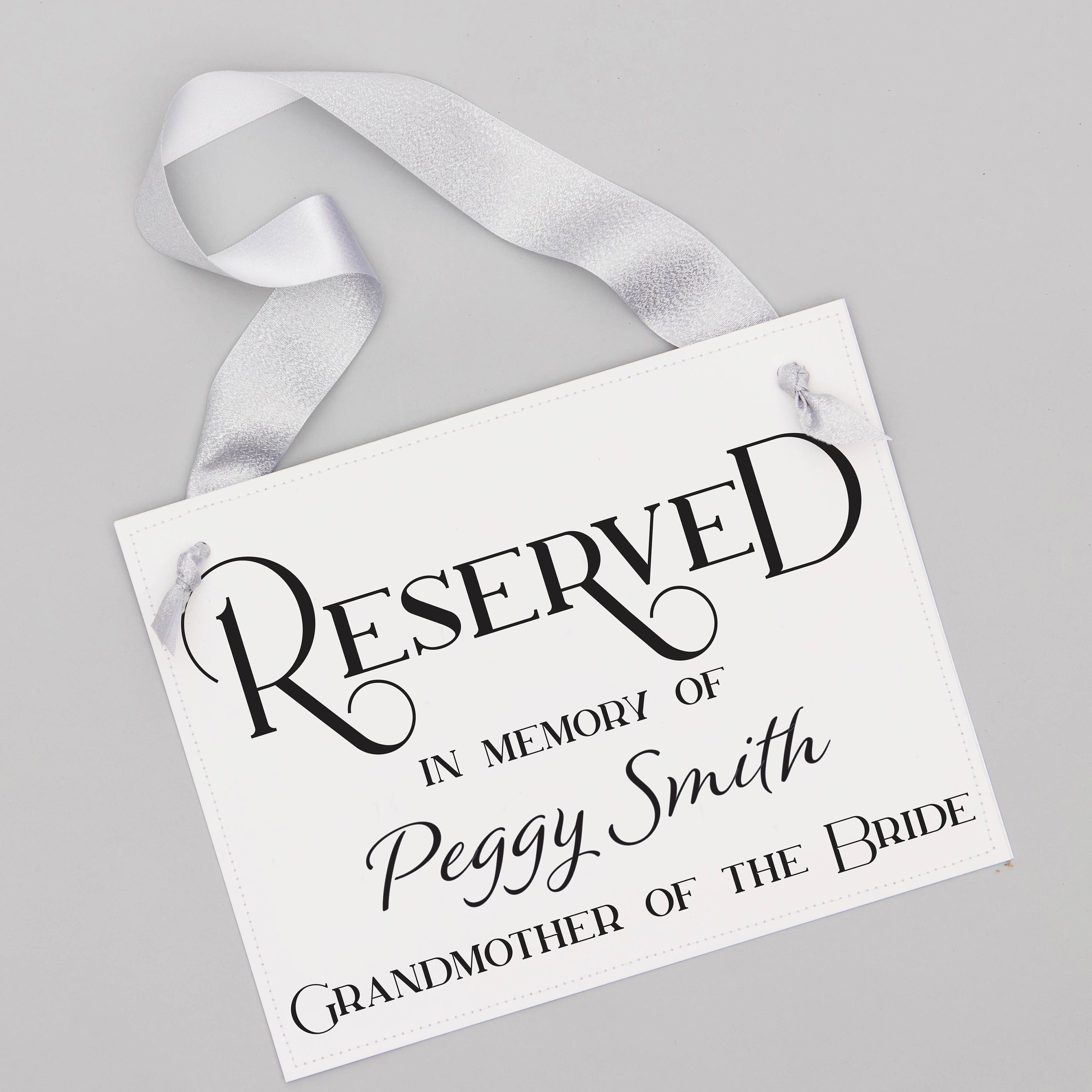 Pay tribute to the loved ones who were present in spirit on your special day with our personalized memorial wedding signs. These lovingly crafted signs, customized with their name and your choice of ribbon color, reserve a place of honor to recognize their lasting impact. Each sign is a gentle reminder of their love and legacy, ensuring they are remembered and cherished as you celebrate new beginnings.