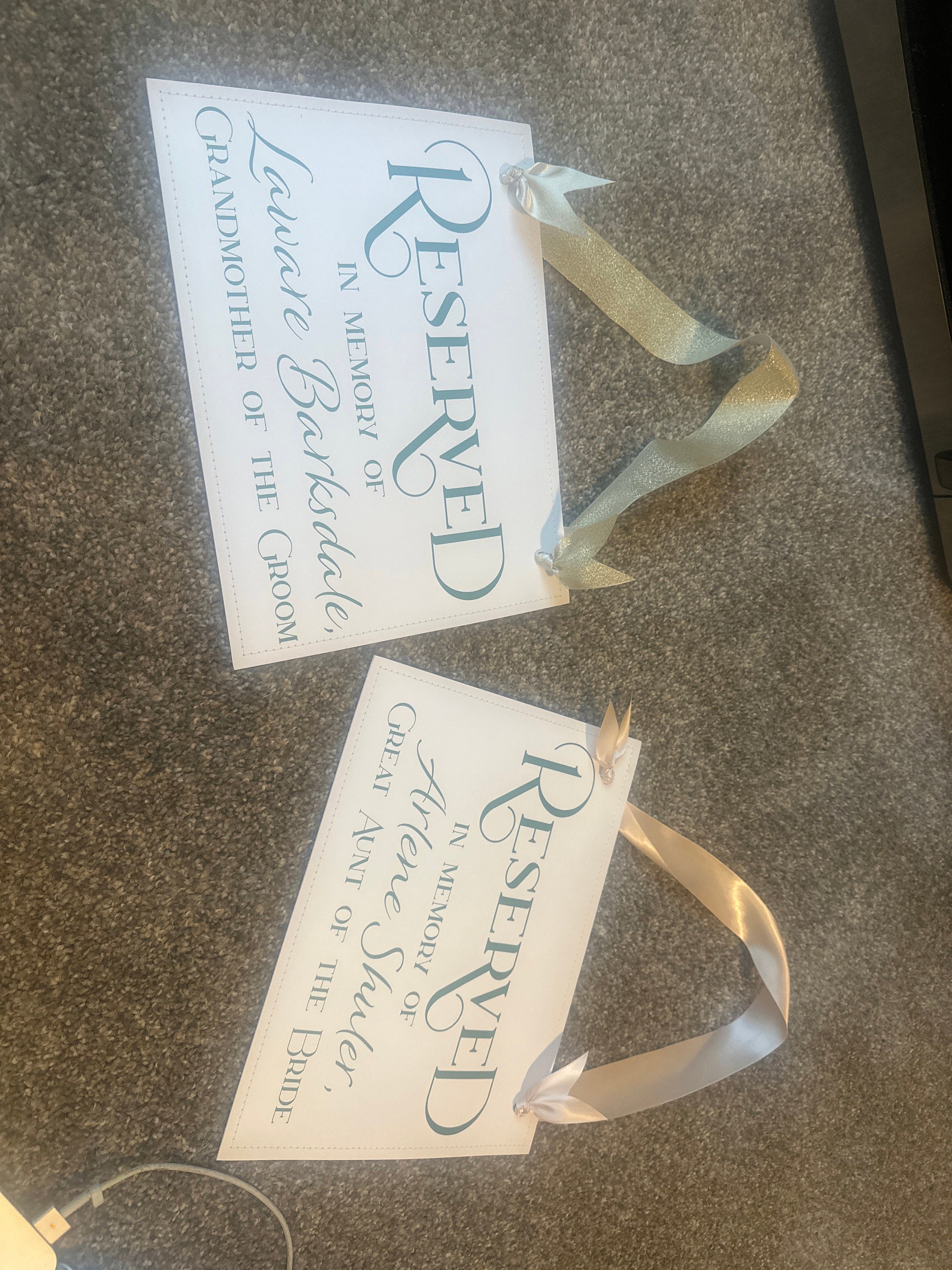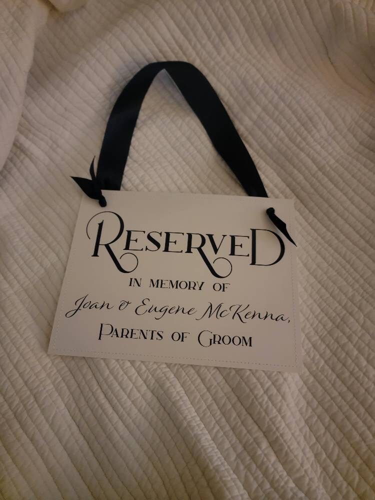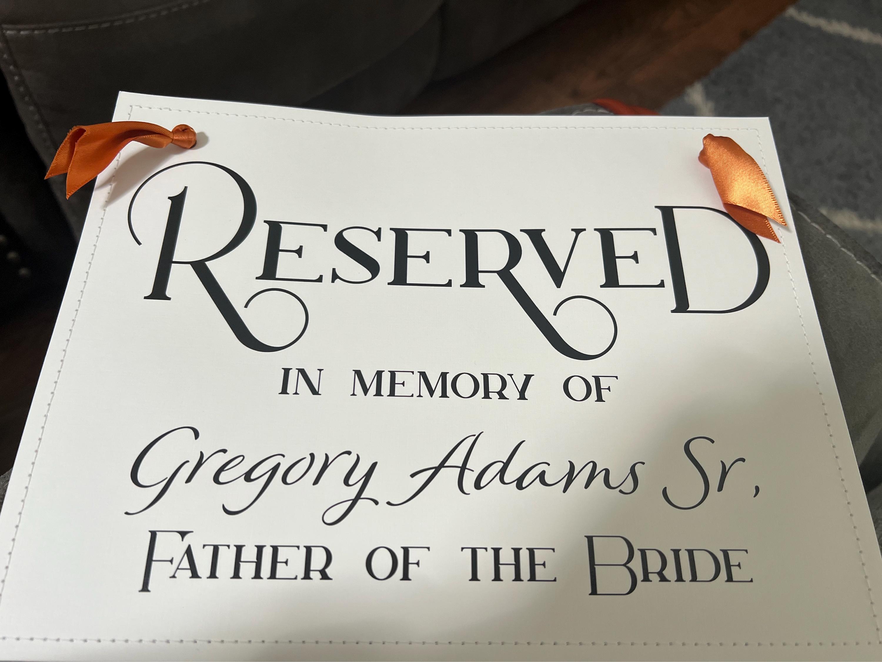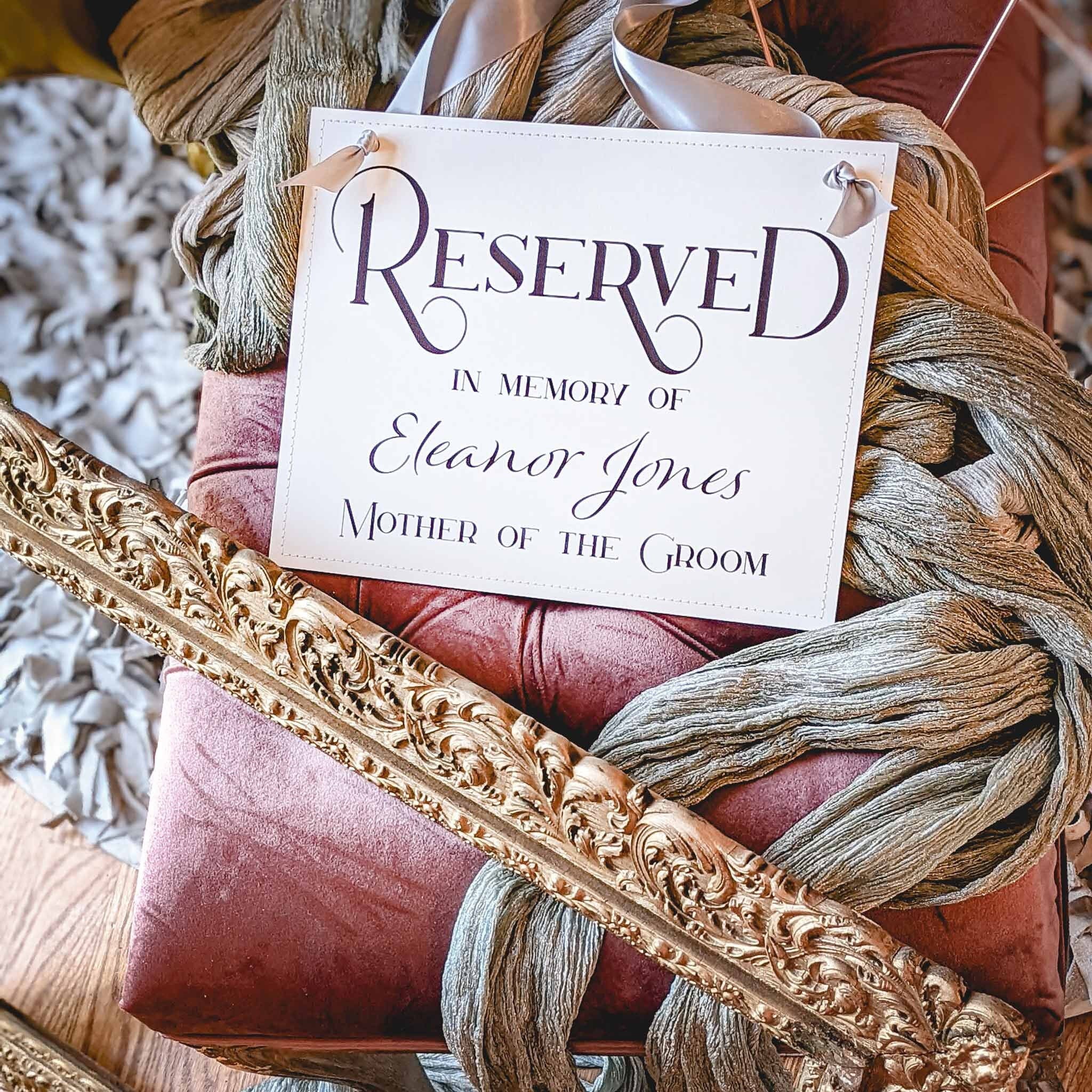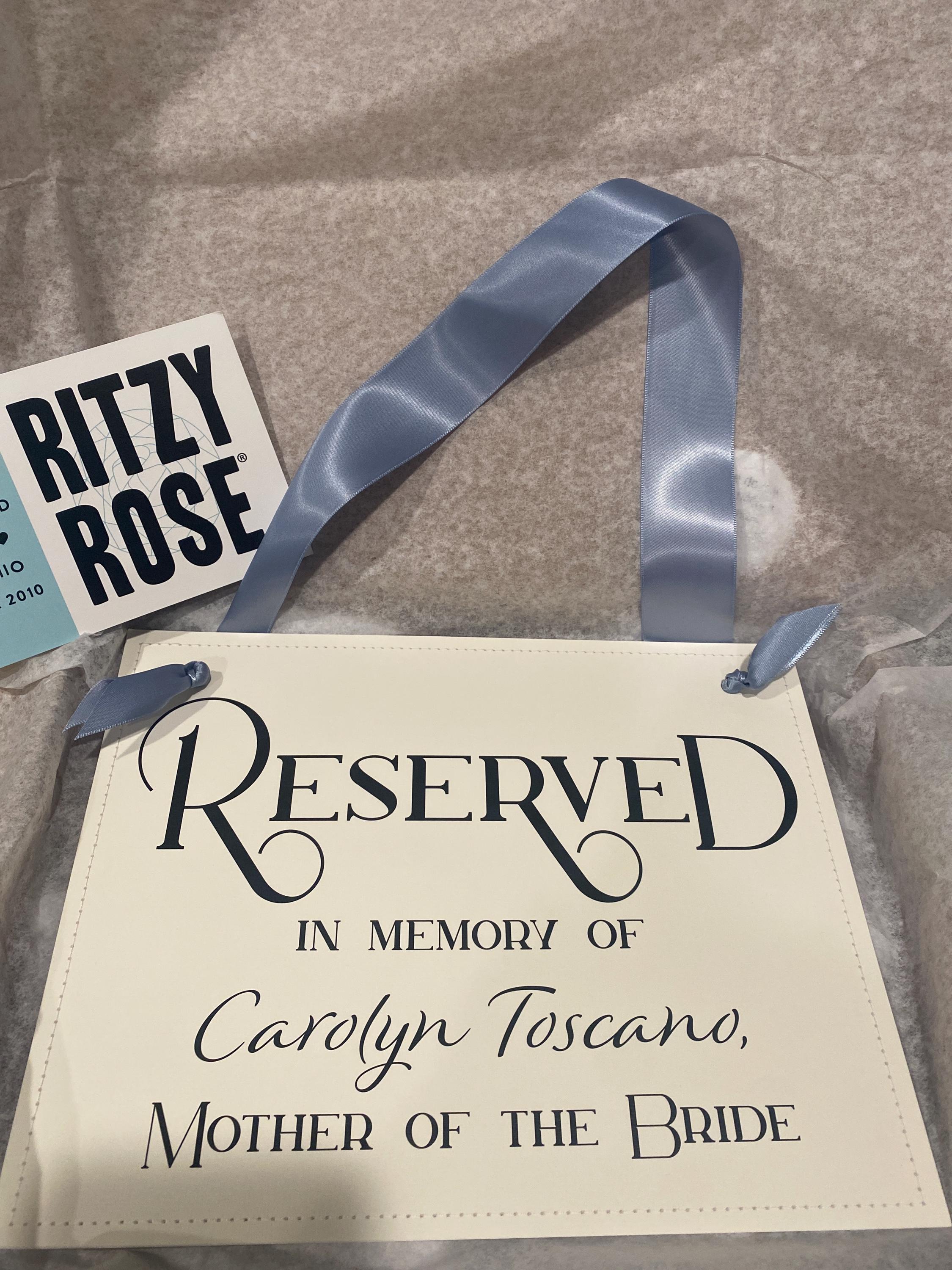Pay tribute to the loved ones who were present in spirit on your special day with our personalized memorial wedding signs. These lovingly crafted signs, customized with their name and your choice of ribbon color, reserve a place of honor to recognize their lasting impact. Each sign is a gentle reminder of their love and legacy, ensuring they are remembered and cherished as you celebrate new beginnings.