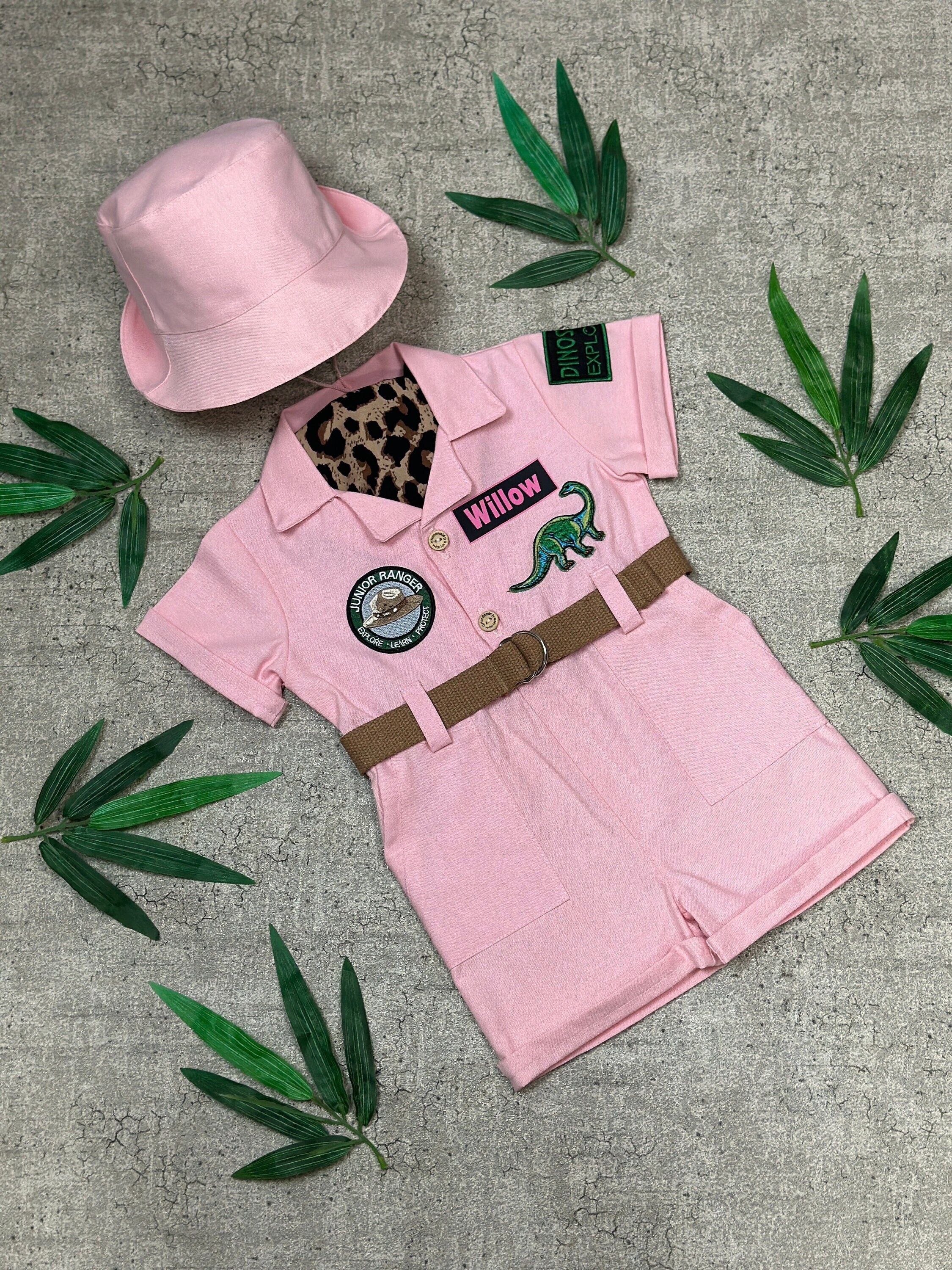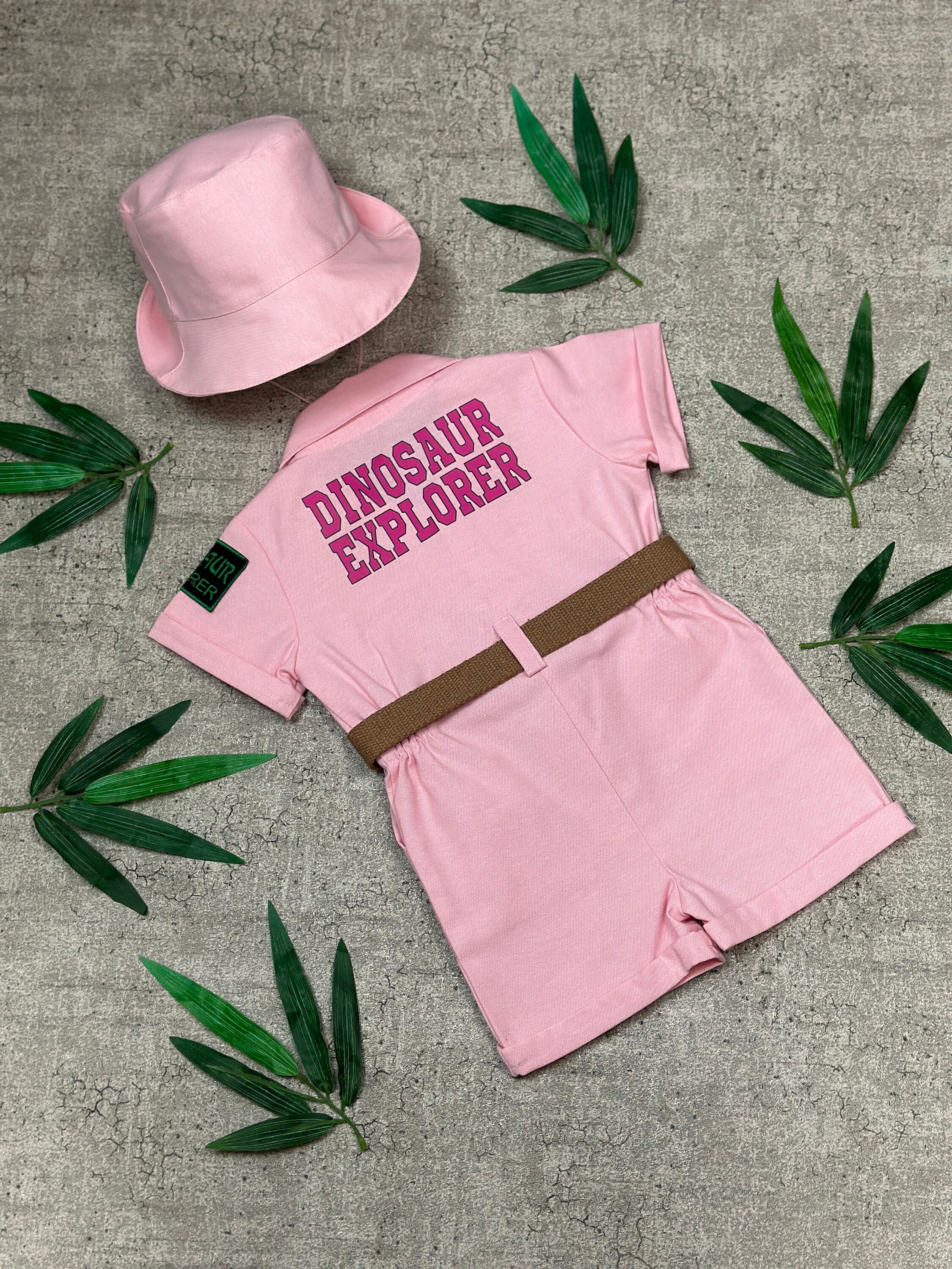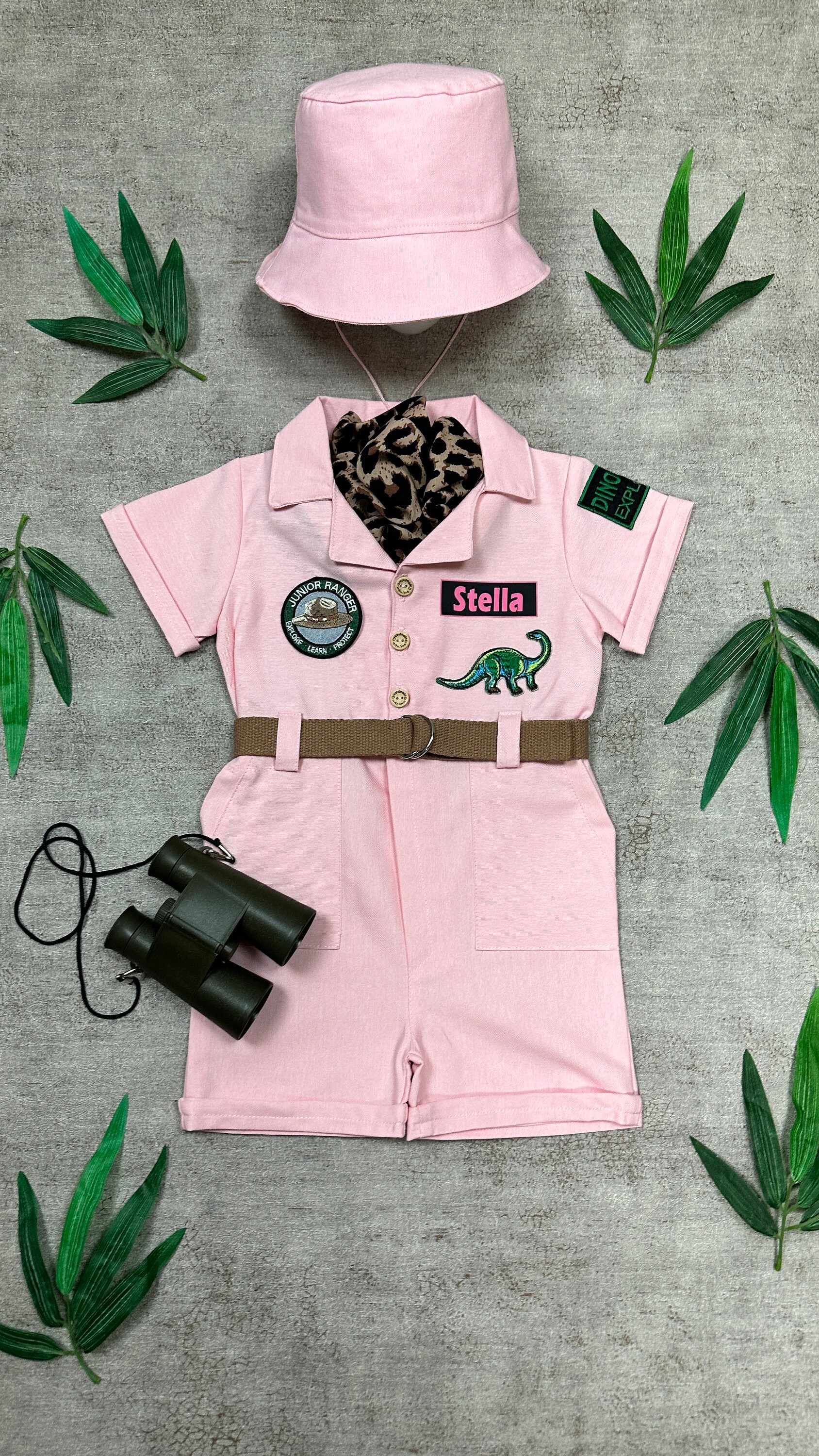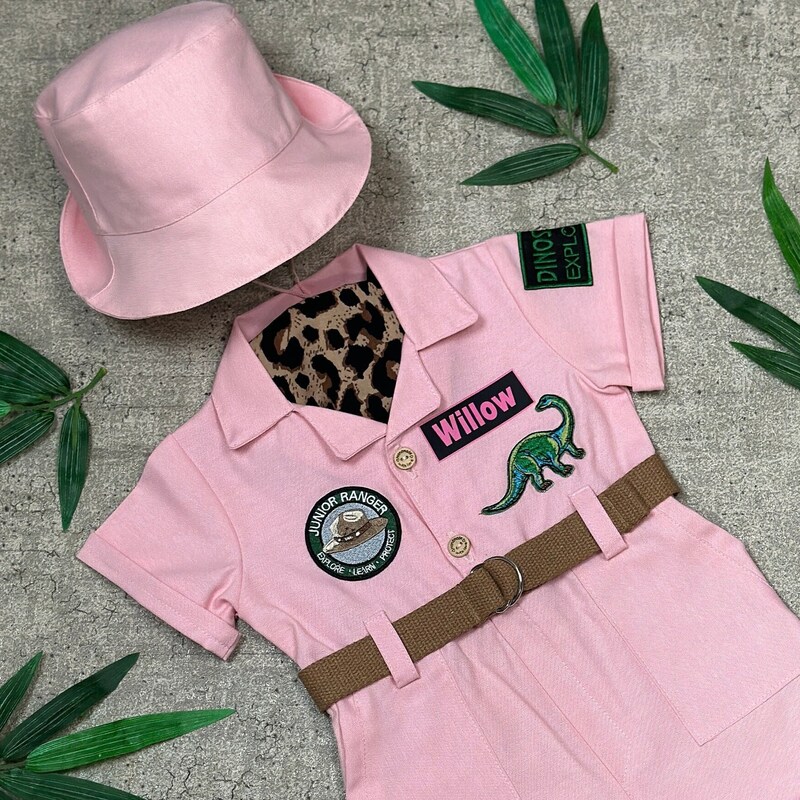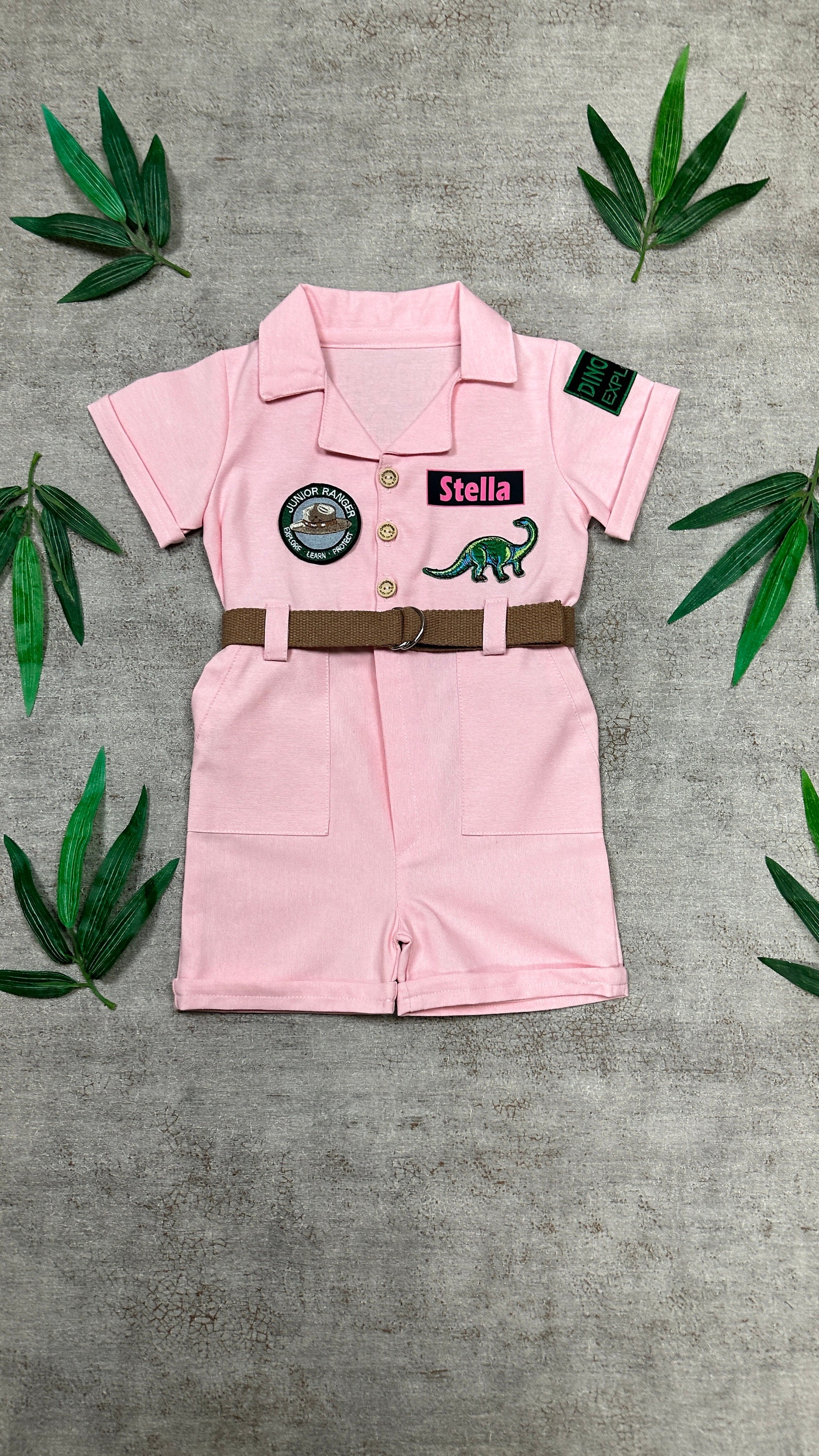 🦕Made with the utmost care and attention to detail, this one piece jumpsuit captures the essence of a true dinosaur explorer. The jumpsuit features a safari-inspired design with pink tones, complete with adorable animal patches that add a touch of authenticity.