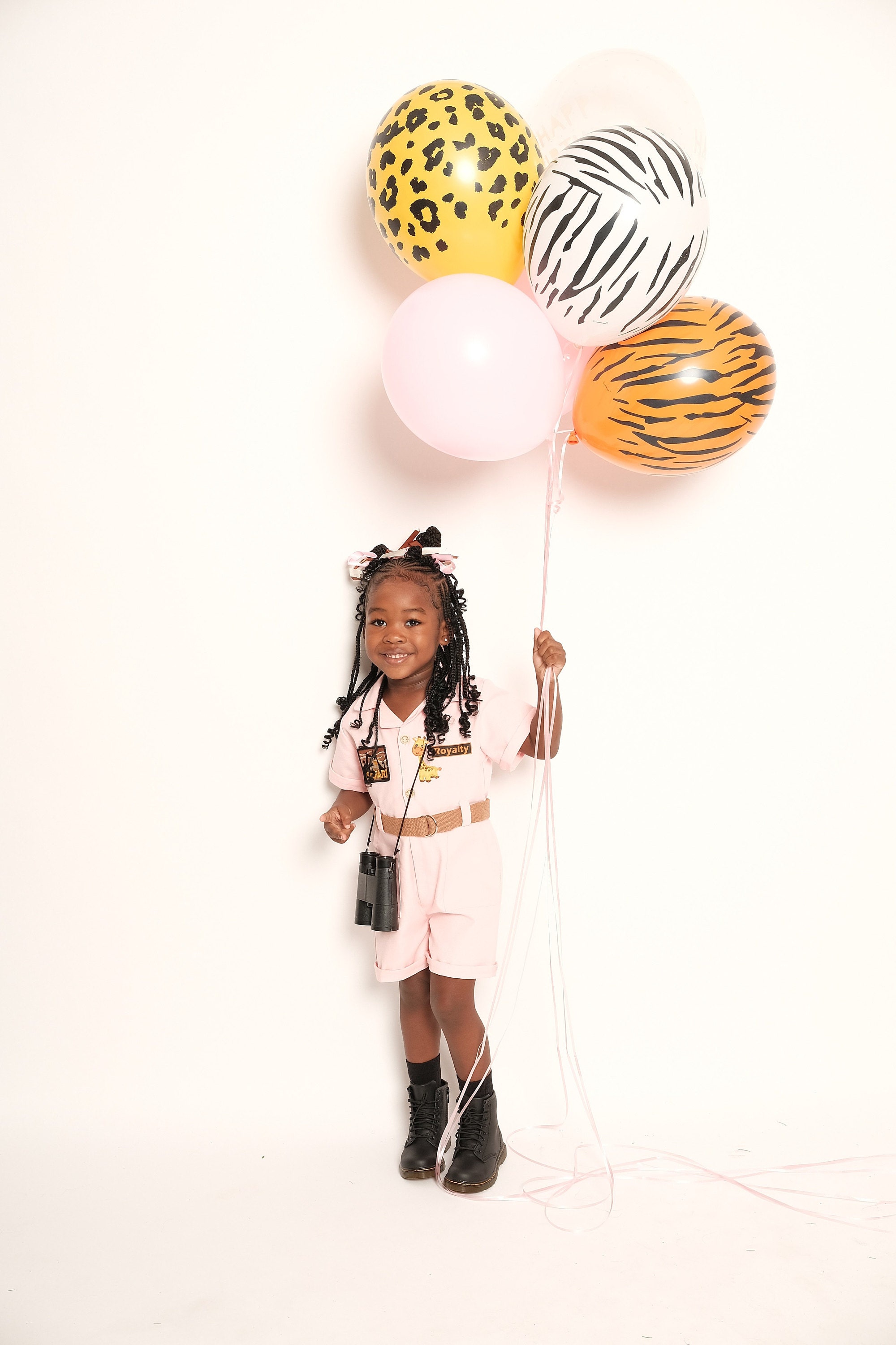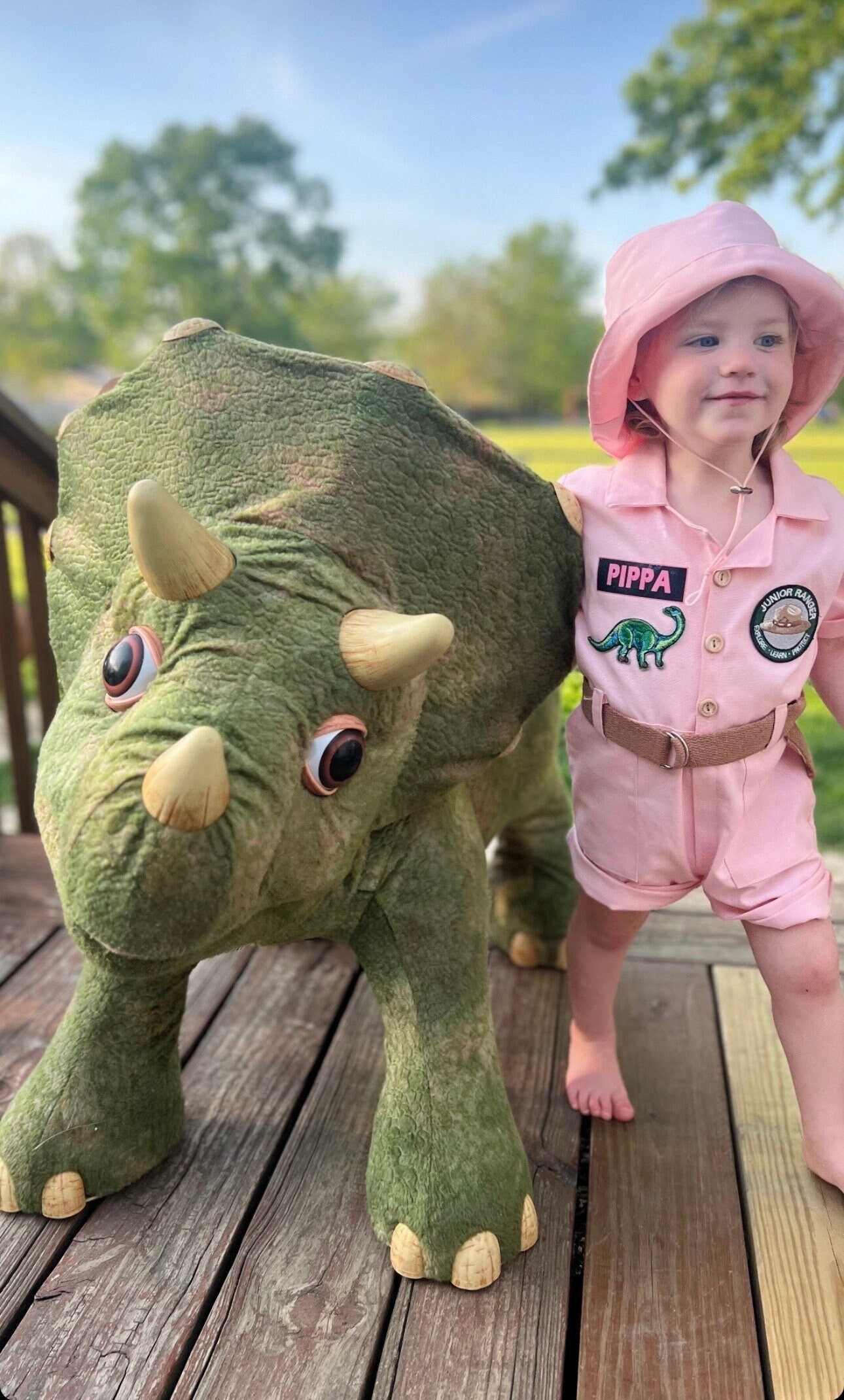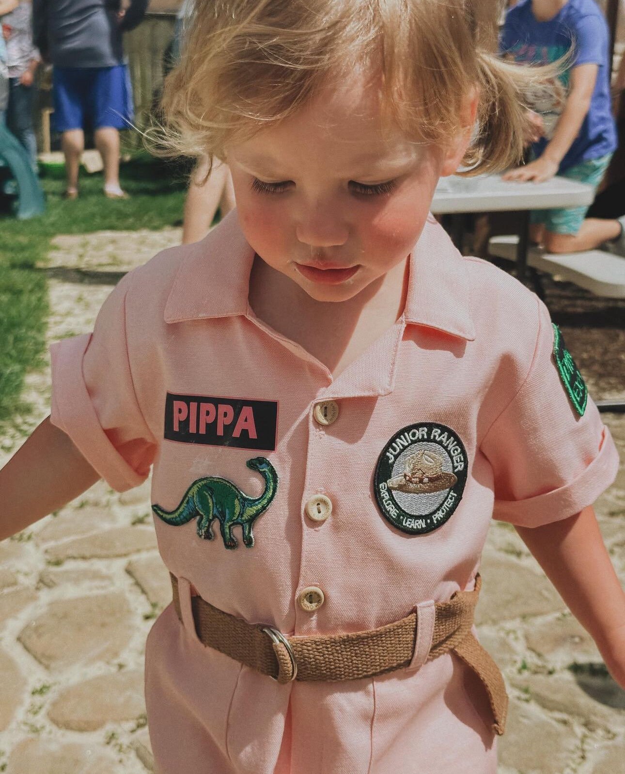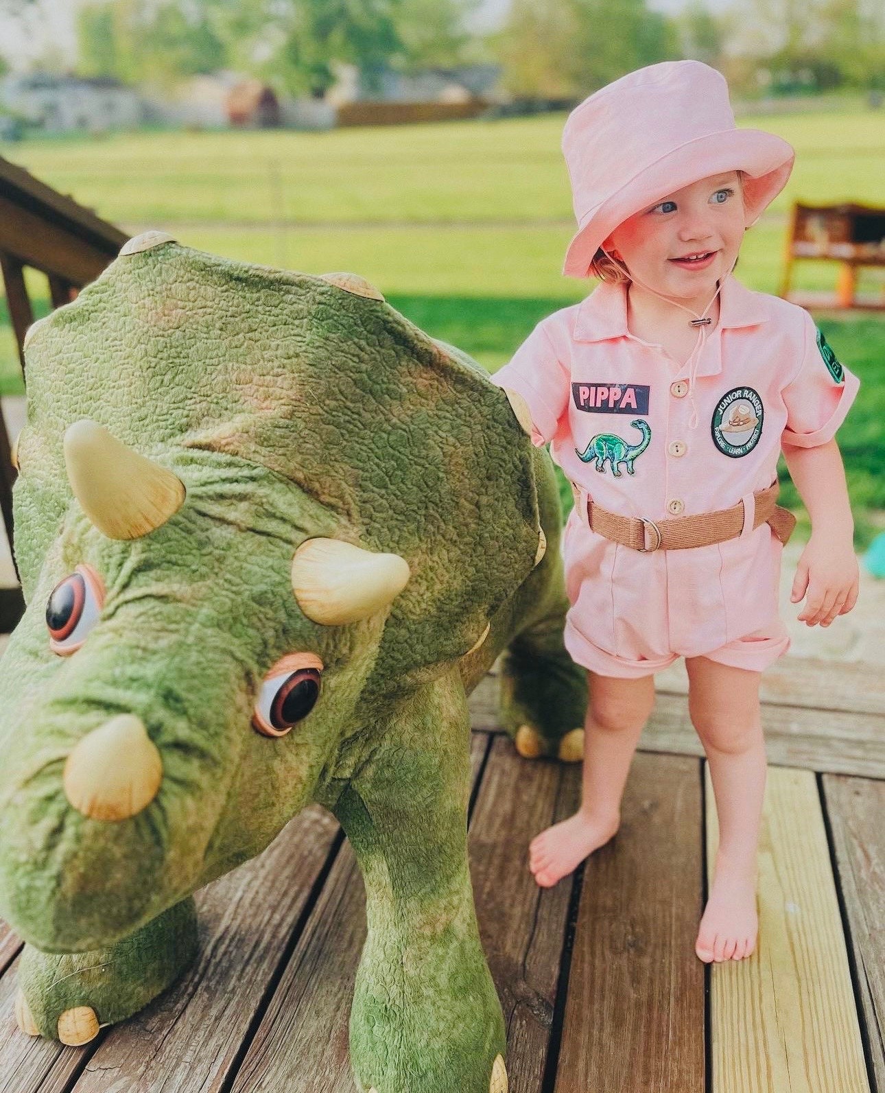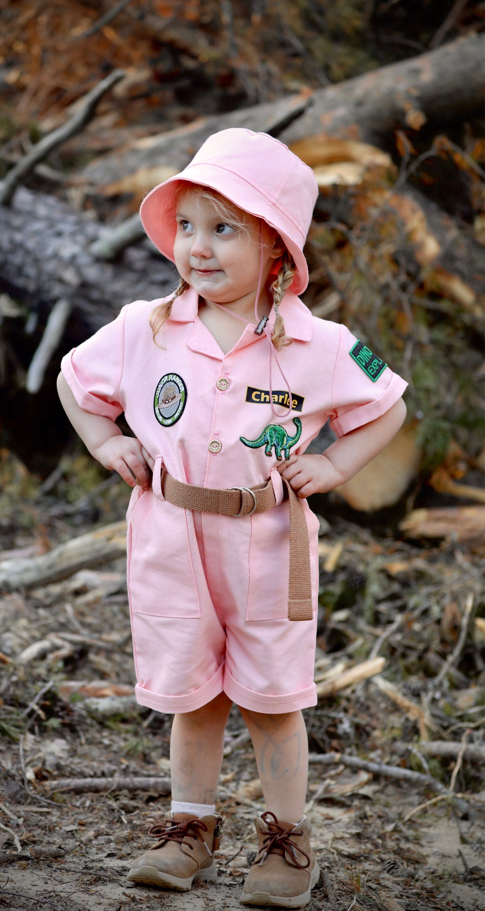 🦕Made with the utmost care and attention to detail, this one piece jumpsuit captures the essence of a true dinosaur explorer. The jumpsuit features a safari-inspired design with pink tones, complete with adorable animal patches that add a touch of authenticity.